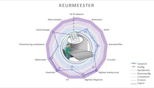 In je werk heb je steeds te maken met technologische vernieuwingen. Voor jouw functie hebben we met een Ontwikkeldiagram in kaart gebracht wat je nodig hebt om je werk goed te kunnen blijven uitvoeren. Elk punt staat voor een vaardigheid. Met een cijfer van 1 tot 5 staat aangegeven hoeveel kennis en ervaring je nodig hebt. De gestippelde lijn is een inschatting van de huidige kennis en ervaring. De blauwe lijn staat voor het niveau dat in de de branchekwalificatienorm is vastgelegd.