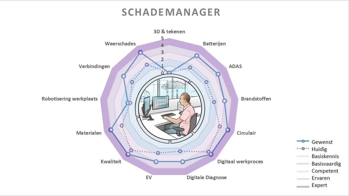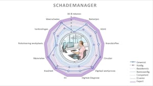 In je werk heb je steeds te maken met technologische vernieuwingen. Voor jouw functie hebben we met een Ontwikkeldiagram in kaart gebracht wat je nodig hebt om je werk goed te kunnen blijven uitvoeren. Elk punt staat voor een vaardigheid. Met een cijfer van 1 tot 5 staat aangegeven hoeveel kennis en ervaring je nodig hebt. De gestippelde lijn is een inschatting van de huidige kennis en ervaring. De blauwe lijn staat voor het niveau dat in de de branchekwalificatienorm is vastgelegd.