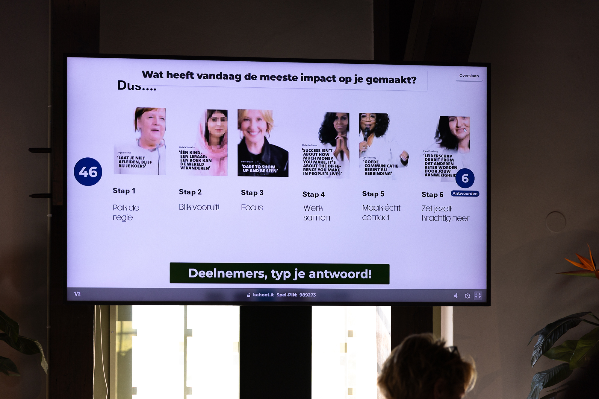 Na de lunch is het tijd voor de twee afsluitende stappen. De groepen gaan aan de slag met communicatiestijlen en verbinden. ‘Goede communicatie begint bij verbinding’, zoals rolmodel Oprah Winfrey zei. Afsluitend wordt er gewerkt aan zichtbaarheid. Hier gaat het om oefenen hoe je jezelf duidelijk, stevig en authentiek presenteert. Het resultaat: impact maken op jouw manier, met hoofd én hart.