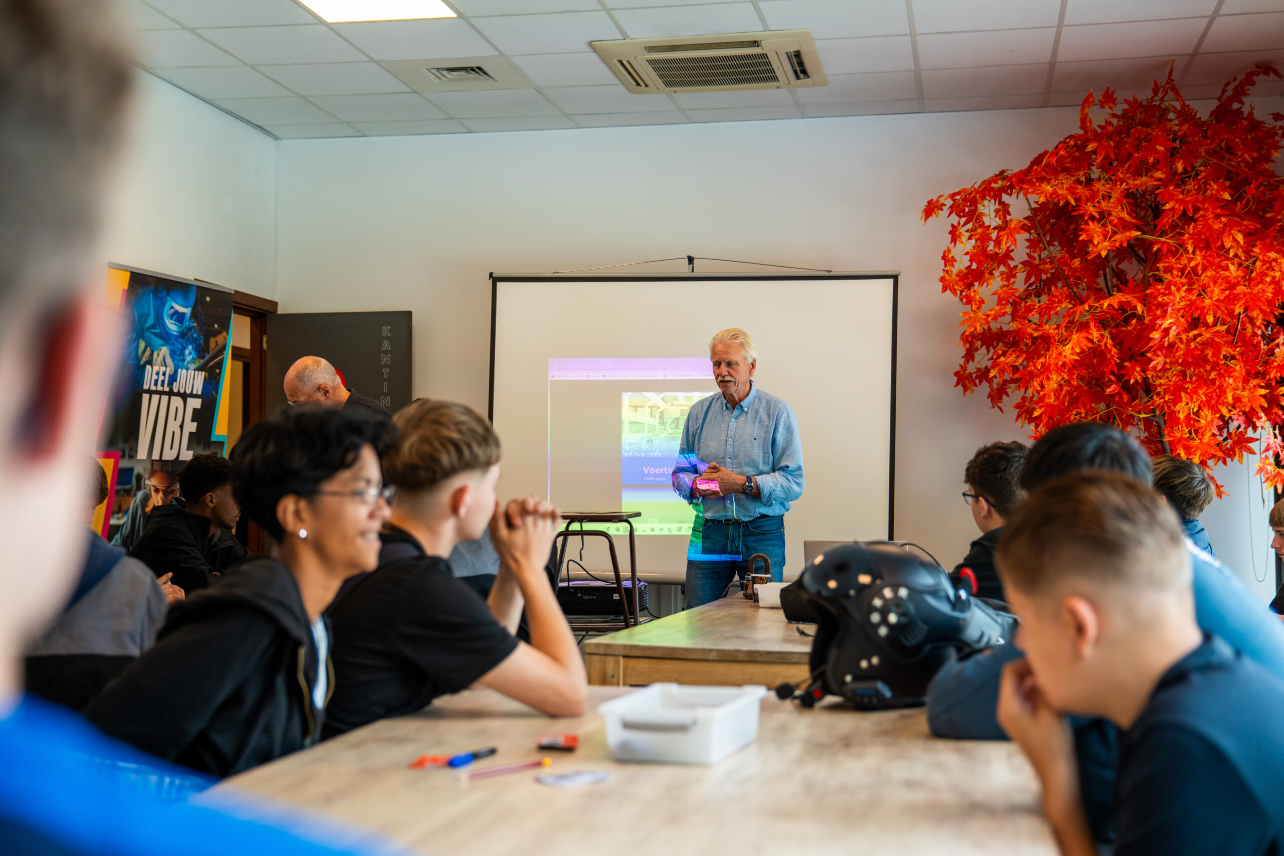 “Op deze leeftijd hebben jongeren een korte spanningsboog”, zegt hij met een lach. “Daar moet je rekening mee houden.” Daarom is zijn introductie lekker interactief, met quizjes en praktijkvoorbeelden. En dat werkt: zodra de leerlingen mogen raden wat een bepaalde schade zou kosten of welke kleurstaal het dichtst bij de auto komt, gaan de ogen glimmen.
