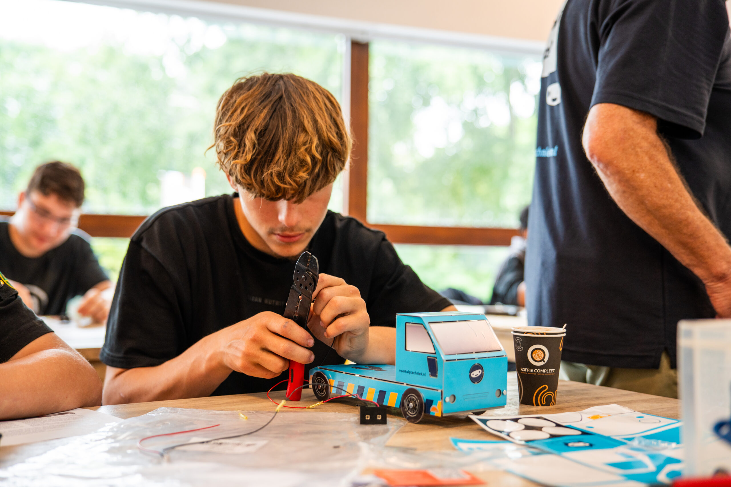 Na de interactieve introductie volgen de leerlingen twee gastlessen van Voertuigtechniek.nl. Tijdens het uitdeuken werken de leerlingen aan hun eigen werkstation en is het een lawaai van jewelste. Bij de tweede workshop bouwen ze een miniatuurtruck. De leerlingen beginnen wat onzeker, maar al snel zijn ze fanatiek bezig en spat het plezier ervan af.