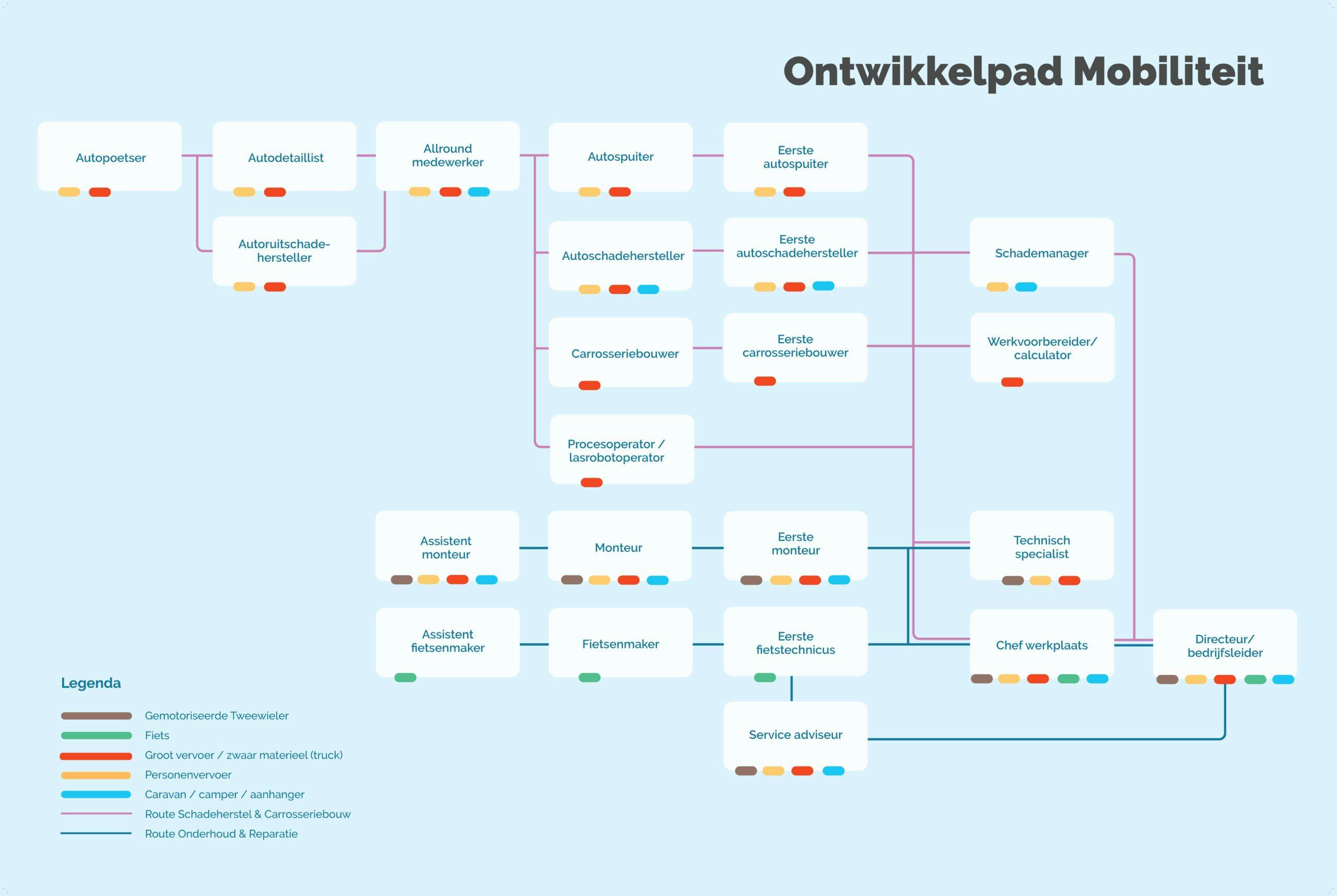 Wil een medewerker zich specialiseren, doorgroeien of een nieuwe richting inslaan binnen de carrosseriebranche? In het ontwikkelperspectief zie je welke functies en specialisaties mogelijk zijn vanuit de huidige functie.